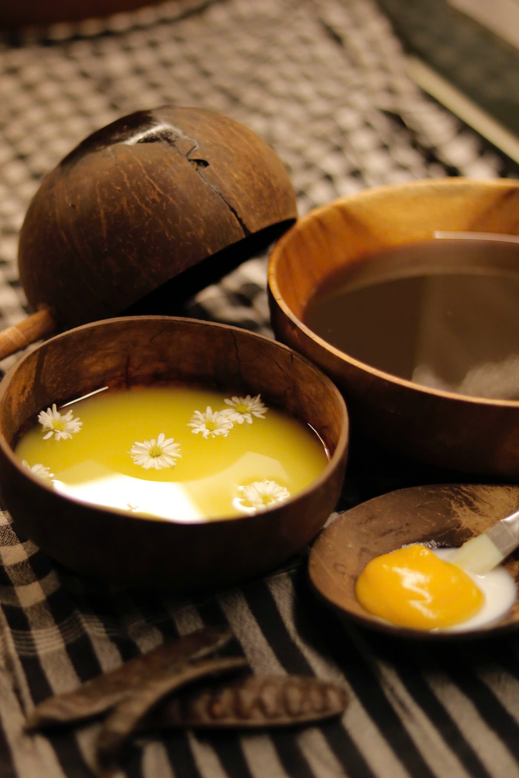 Ngay từ giây phút đầu tiên bước chân vào An Miên, khứu giác của bạn sẽ được đánh thức bởi hương bồ kết nướng đặc trưng. Không phải mùi hóa chất nồng nặc, mà là mùi hương xưa cũ, mộc mạc quyện cùng thảo mộc tự nhiên. Tiếng nhạc thiền khe khẽ, du dương hòa cùng không gian tĩnh lặng tạo nên một bản giao hưởng của sự bình yên.