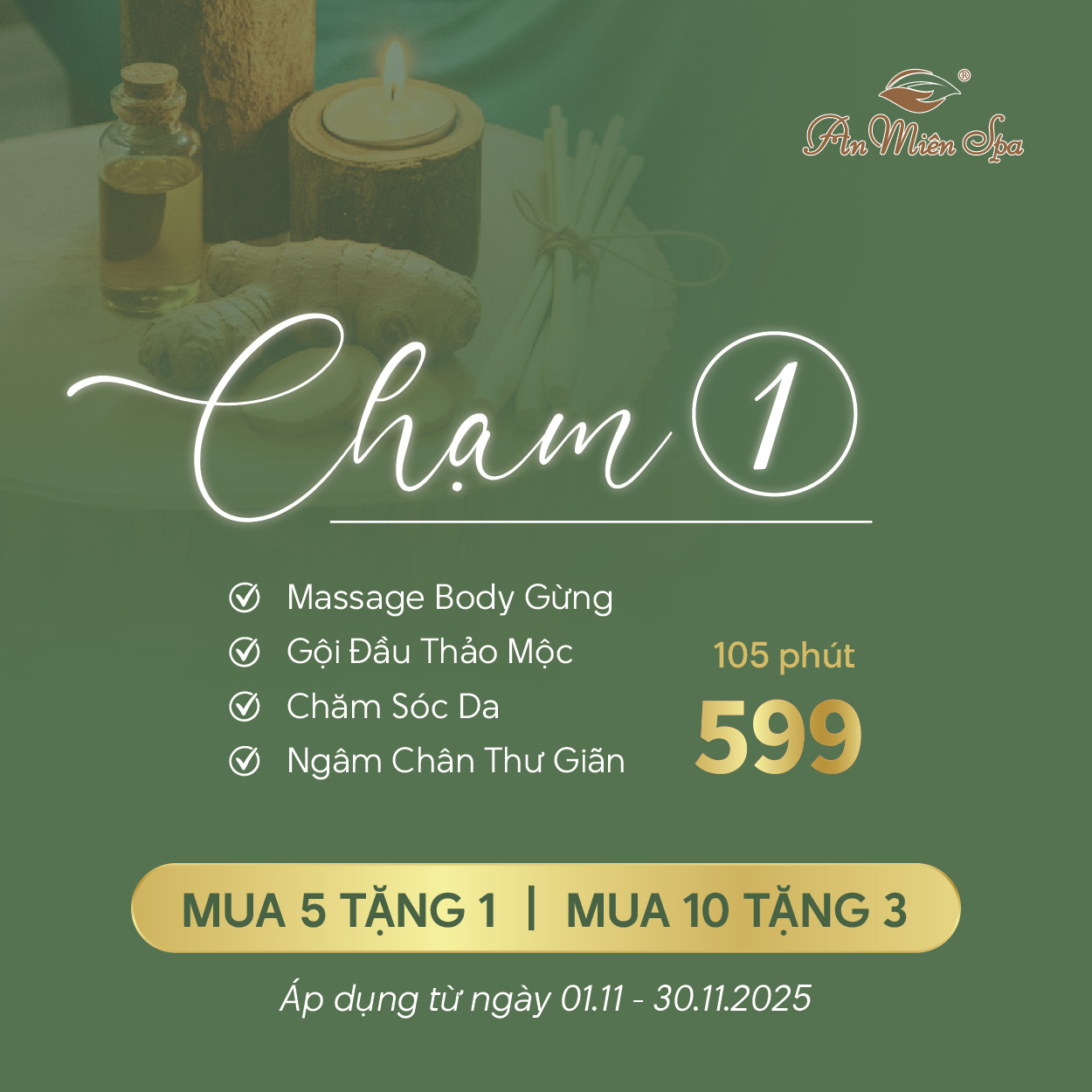 Combo CHẠM 1 là sự kết hợp hoàn hảo của 4 liệu pháp, gói gọn 105 phút chữa lành toàn diện từ thể chất đến tinh thần. Mỗi bước đi đều được thiết kế tỉ mỉ, giúp cơ thể được nghỉ ngơi sâu và tâm hồn tìm lại sự an yên.