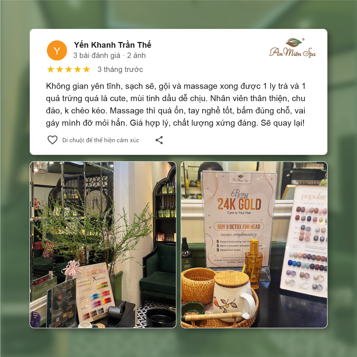 Mỗi khách hàng đến với An Miên đều mang theo một câu chuyện riêng. Có người tìm đến để giải tỏa áp lực công việc, có người muốn tìm lại ký ức tuổi thơ qua mùi hương thảo mộc, cũng có người đơn giản là muốn tìm một góc trú ẩn sau những bão giông cuộc đời. Việc lắng nghe những lời khen ngợi không chỉ giúp đội ngũ nhân viên cảm thấy được khích lệ, mà quan trọng hơn, nó giúp chúng tôi biết rằng mình đang thực hiện đúng sứ mệnh: Mang lại sự an nhiên thực sự cho cộng đồng.