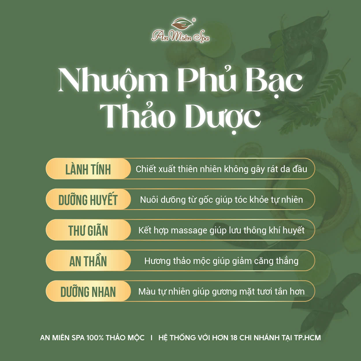 Thấu hiểu nỗi lòng đó, An Miên Spa mang đến một “chốn về” thân thuộc, nơi mẹ có thể rũ bỏ mọi mệt mỏi và tìm lại màu tóc của những ngày xưa cũ. Chúng mình chọn thảo mộc không chỉ vì hiệu quả nhuộm màu, mà còn vì sự an toàn tuyệt đối cho da đầu và sức khỏe của những người lớn tuổi.