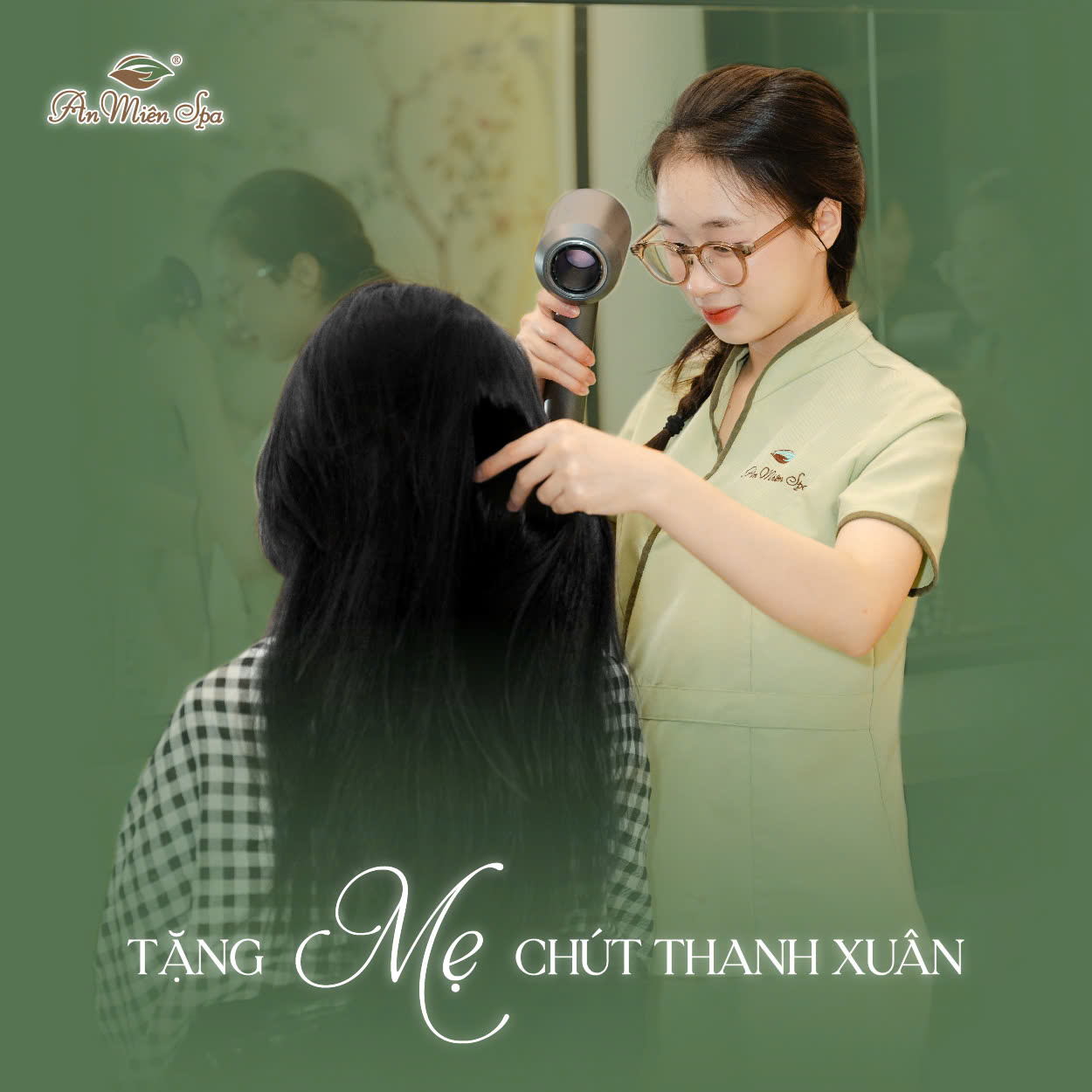 Tại An Miên Spa, chúng mình tin rằng việc chăm sóc mái tóc cho mẹ không chỉ là làm đẹp, mà là một cách để nói lời tri ân dịu dàng nhất. Hãy để An Miên cùng bạn gửi trao món quà thanh xuân thông qua liệu trình nhuộm tóc thảo dược tự nhiên – một giải pháp an tâm, lành tính như chính sự chăm sóc của gia đình.