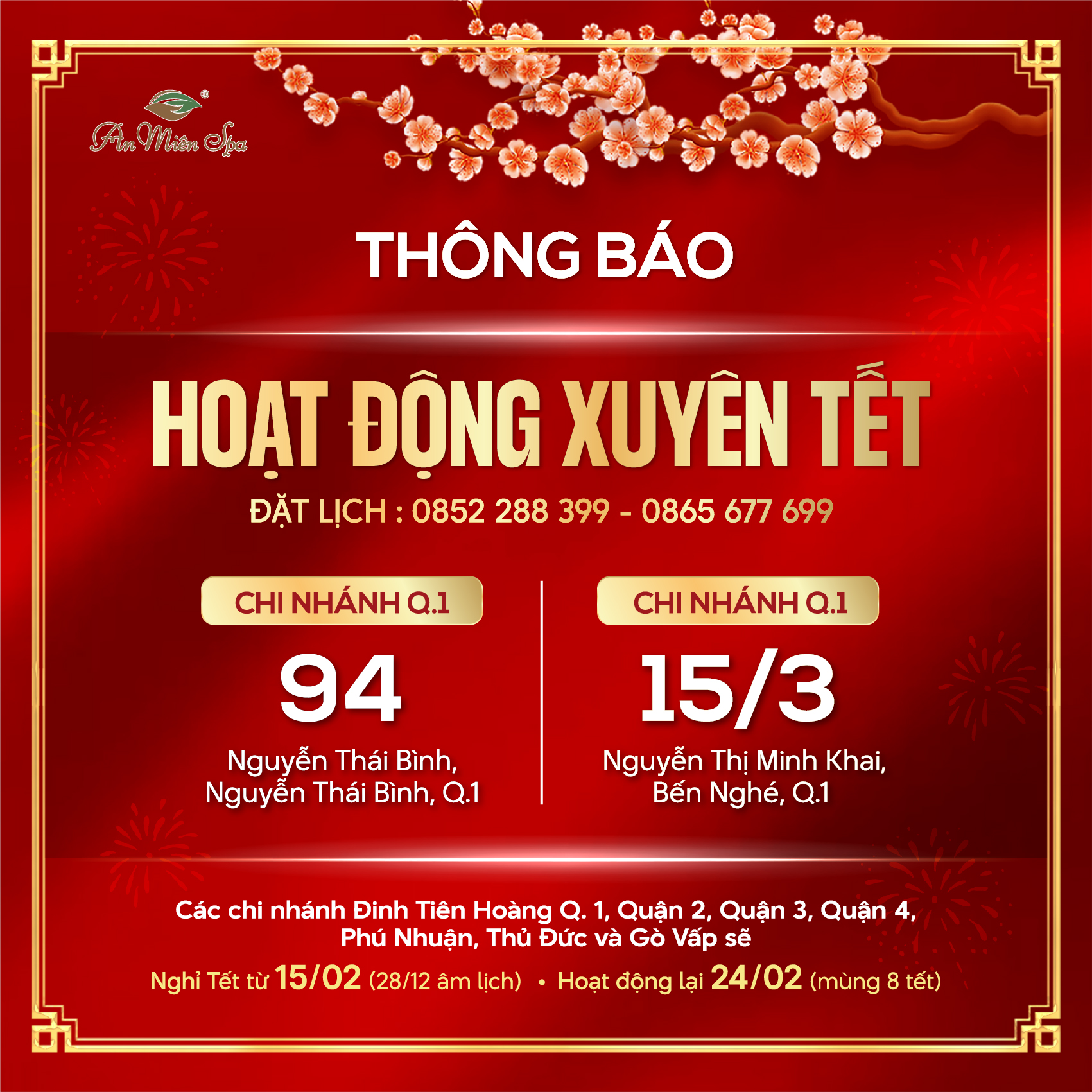 Bạn đang tìm kiếm spa hoạt động Tết TPHCM 2026 để thư giãn, gội đầu dưỡng sinh hay chăm sóc da sau những ngày dọn dẹp tất bật? Tết là khoảng thời gian cơ thể cần được “F5” nhất, hiểu được điều đó, An Miên Spa xin gửi đến quý khách hàng lịch hoạt động chi tiết để bạn chủ động sắp xếp thời gian làm đẹp.