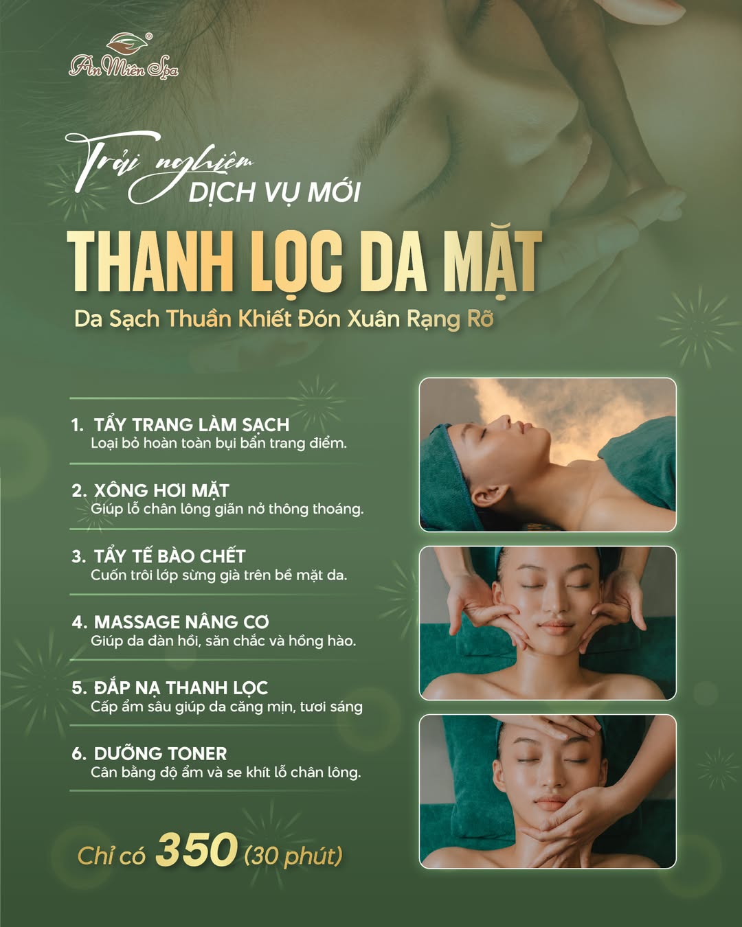 Sau lớp bụi đường phố thị và những đêm thiếu ngủ vì công việc, làn da cũng biết mệt mỏi. Nó trở nên xỉn màu, khô ráp và thiếu sức sống. Thấu hiểu điều đó, An Miên thương mời bạn trải nghiệm dịch vụ mới ra mắt: Thanh lọc da mặt – liệu trình 30 phút để làn da được hồi sinh và rạng rỡ đón xuân.