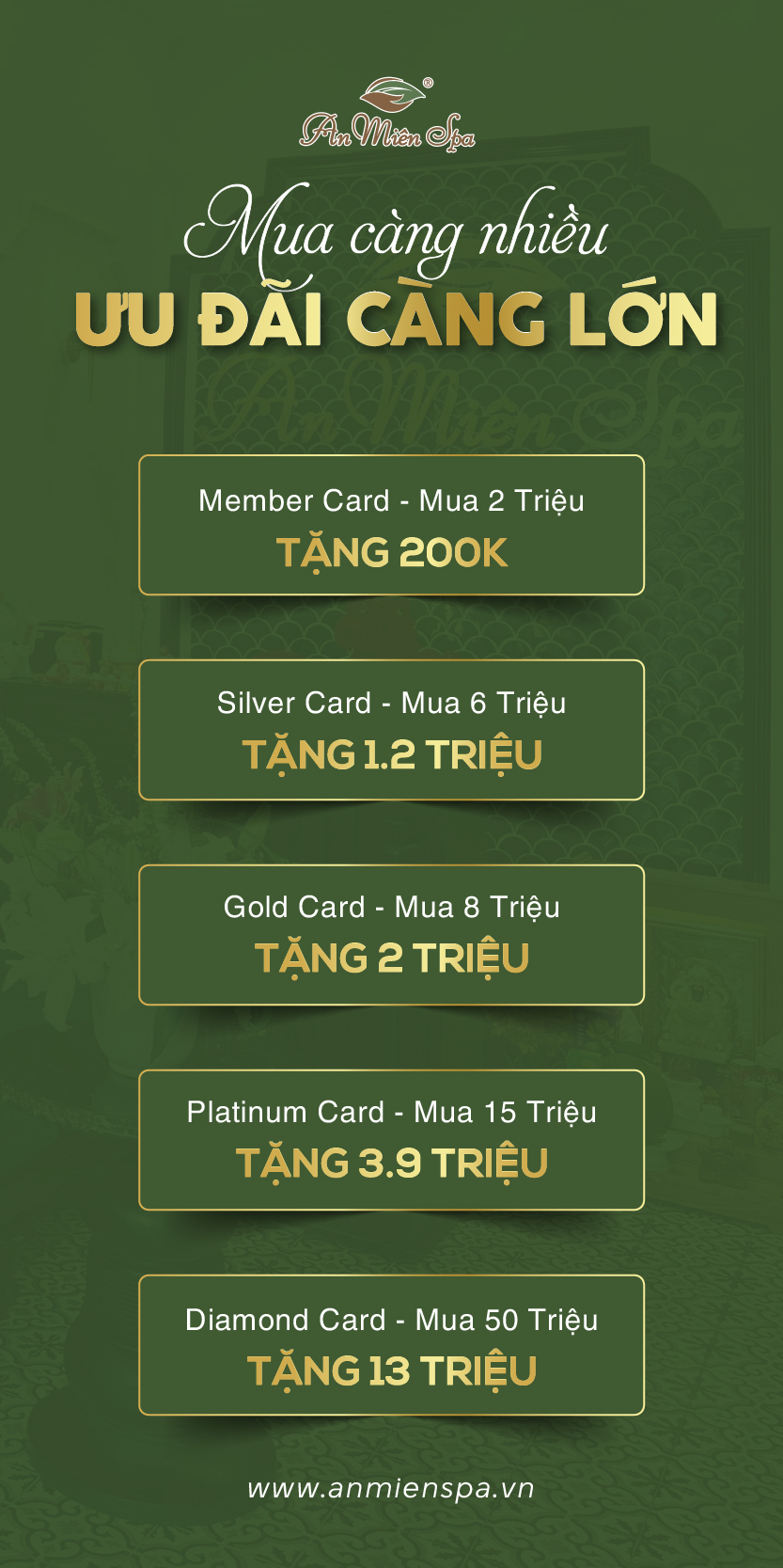 Hệ thống thẻ thành viên của An Miên được thiết kế đa dạng, từ hạng Member đến Diamond, nhằm đáp ứng mọi nhu cầu và khả năng tài chính của khách hàng. Khi sở hữu tấm thẻ này, bạn sẽ nhận được những giá trị vượt trội: