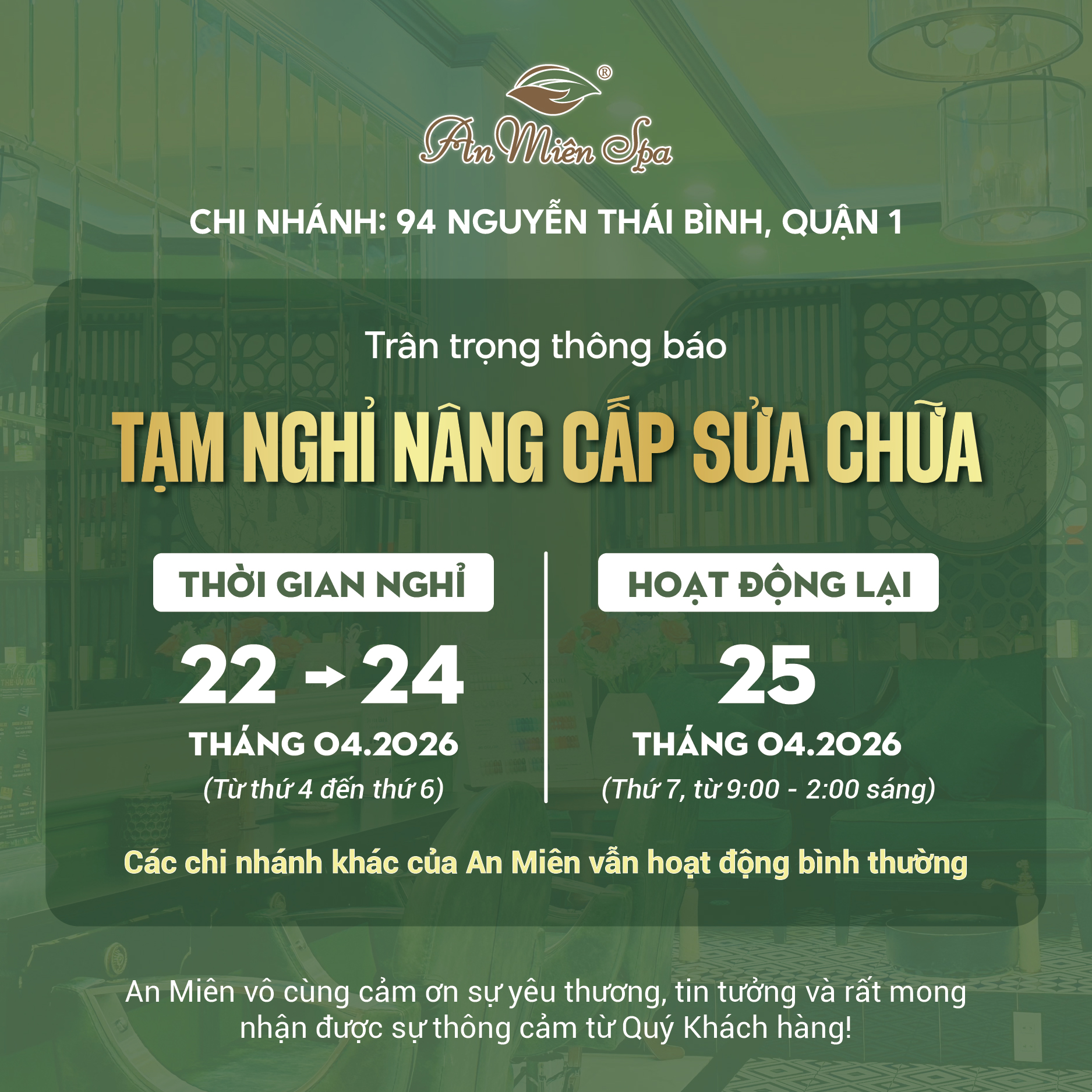 Tại An Miên Spa, chúng mình luôn tin rằng sự hài lòng của khách hàng không chỉ đến từ những chén nước gội bồ kết thơm nồng hay đôi bàn tay massage điêu luyện, mà còn đến từ một không gian thư giãn tiện nghi và chỉn chu nhất. Để hiện thực hóa cam kết không ngừng nâng cao chất lượng dịch vụ, An Miên xin thông báo về việc tạm ngưng hoạt động chi nhánh Quận 1 để tiến hành sửa chữa và nâng cấp cơ sở vật chất.