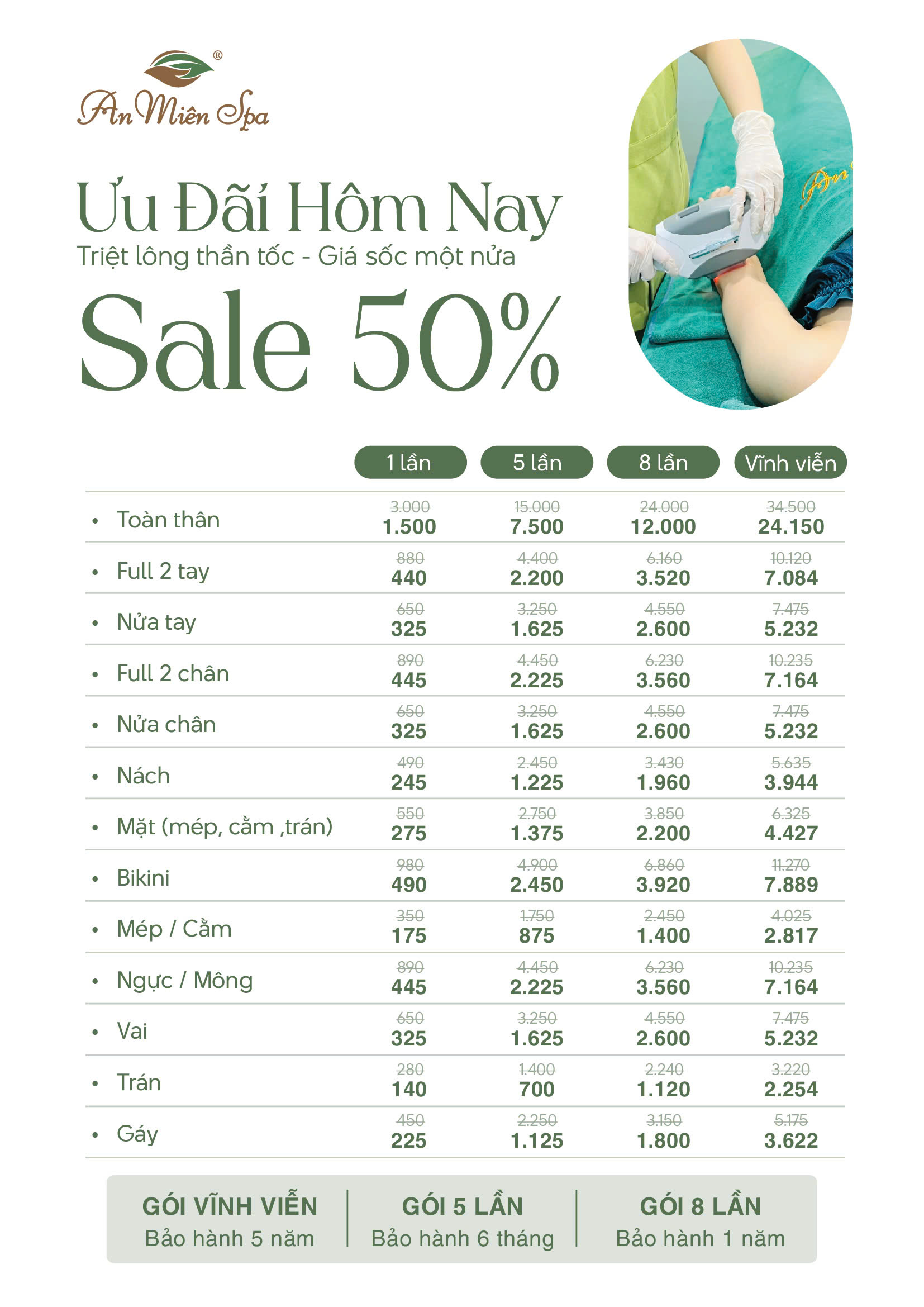 Nhân dịp đặc biệt này, An Miên Spa dành tặng 55 suất duy nhất với ưu đãi giảm ngay 50%, giúp bạn trải nghiệm dịch vụ cao cấp với mức giá cực kỳ hấp dẫn.